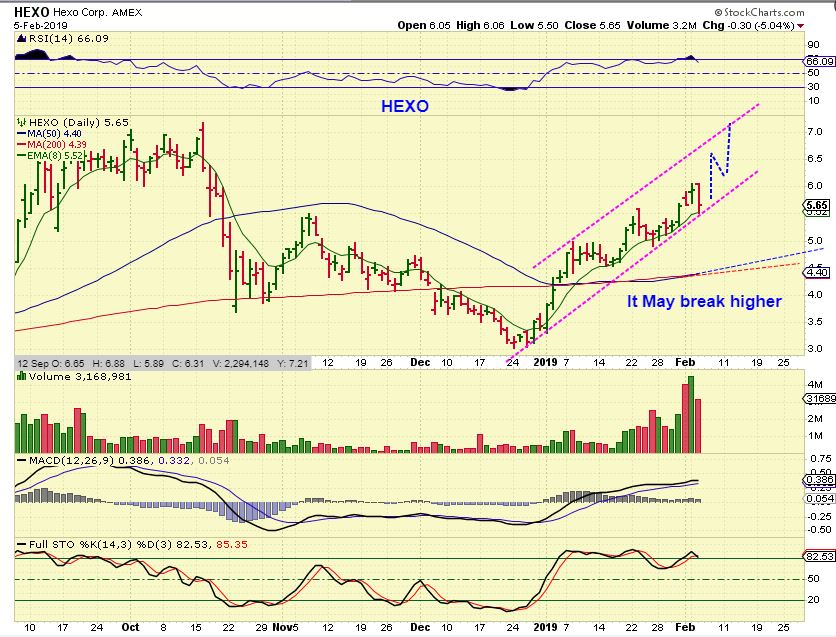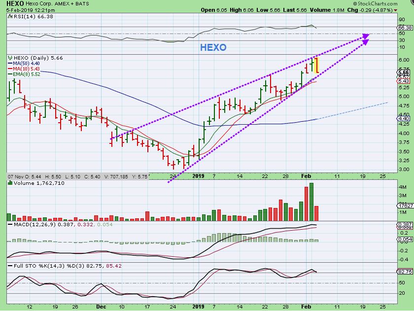 HEXO – If you have been with me for a while, then you have seen me point out rising wedges in the past, and you have seen them break down. It may only be short term bearish, but I am always cautious when I see a rising wedge ( Hexo). So it could be just ‘a temporary top’, but it needs to break higher soon. Why? HEXO never back tested the 50 & 200 sma, and that would be a $1 drop. I may use the 13 sma as a stop. The 10 sma has been slightly broken in the past.