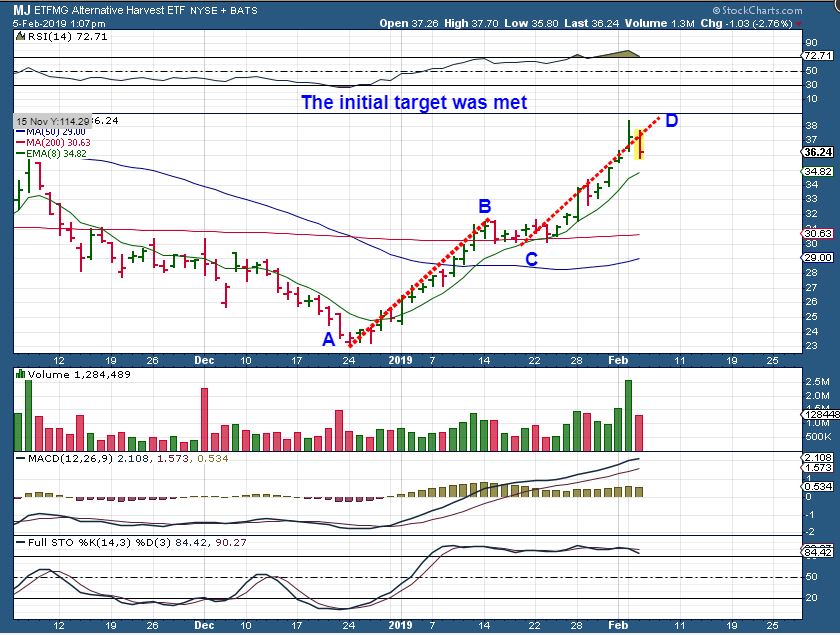 MJ – The MJ ETF did reach an A-B = C-D price projection, but they CAN extend further. A push higher makes this part of a 1-2-3 of 1-2-3-4-5- , so I don’t panic and sell, but I’d use stops. I am thinking that the 8 ema or 10 sma should hold as support if it is not ready for a more meaningful pull back. I would NOT ride this down to make a back test of the 200 sma if that happens next.