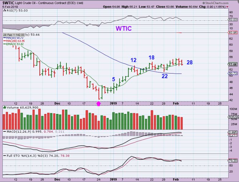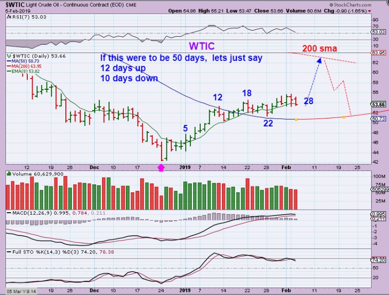 WTIC #2 – On day 28, a 50 day daily cycle would have 22 more days ( 4 weeks). First higher to the 200 sma, and then lower is what I have been saying is possible, as shown. So far it has been a slow crawl. I’d use the 50sma as a stop until we move higher though. The 8 ema is too tight.
