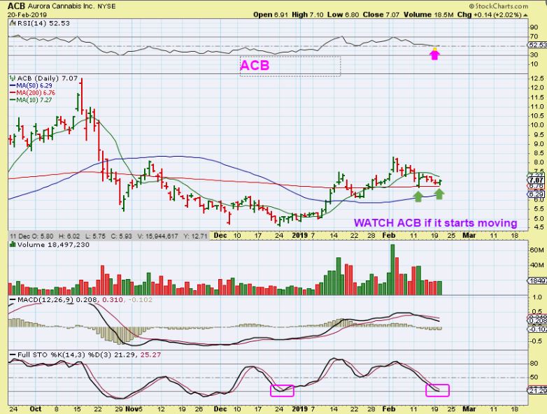 ACB – ACB reversed on the 200sma and this can be bought with a stop under the 200sma, or even some wiggle room below the 50sma. OR…. Buy after a break higher above the 10sma, since that breaks the mini down trend line. These run fast when they get going.