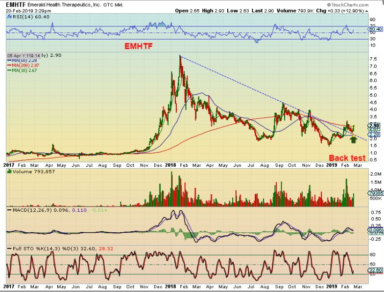 EMHTF – I would still buy this because it broke the downtrend, back tested it, and is ready to go. It is OVERSOLD and the RSI curled up at 50%, volumes are good on up days.