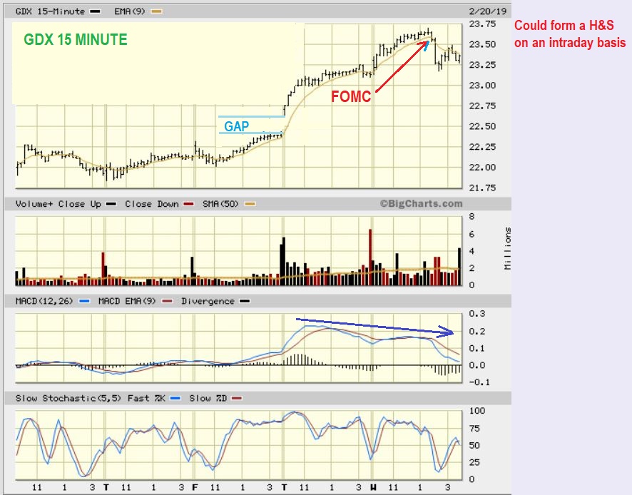 GDX 15 minute intraday – The FOMC dropped the advance, and we do have a gap below. The MACD was weak, even before the FOMC Minutes, because we are due for a pause.