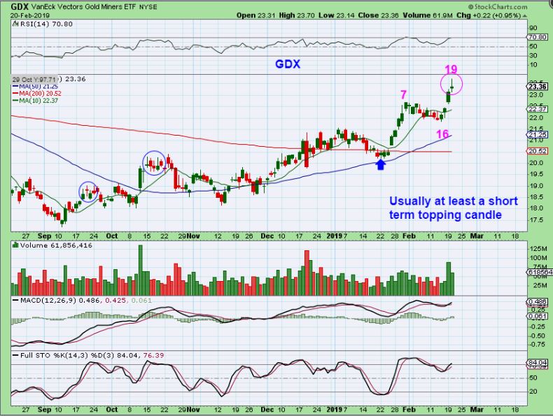 GDX – A topping candle on day 19, and a GAP at $22.50. We have seen these candles in the past lead to a sideways chop & then a drop, so buyers MIGHT be able to prop this up for a bit longer before a deeper dip plays out. See September and October circles, but the point is that we are due for a dip as time goes on. It has been a bullish uptrend and the weekend report gives the Big Picture if needed.
