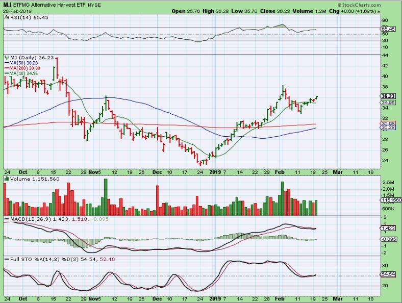 MJ ETF – Many MJ stocks started to move bullishly higher after a pause. The MJ ETF closed above the 10 sma 3 days in a row. This looks good too.