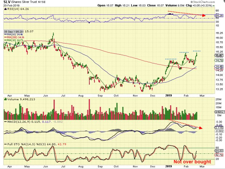 SLV – SLV made new peaks twice, but the volume is lighter and the RSI & MACD have been weakening. I did think that SILVER could quickly shoot higher and catch up with GOLDS run to June highs, but that may or may not happen. I do own some Silver Miners and since they broke out, I’d like to hold on to them. Silver is NOT overbought.
