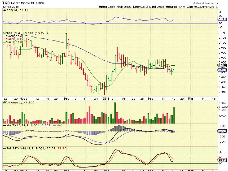 TGB – This looks very much like that first HBM chart ( inverse H&S) that ran well. Both are copper stocks. I posted this Wednesday morning at the open, it is a buy since it closed above the 50sma with strong volume.