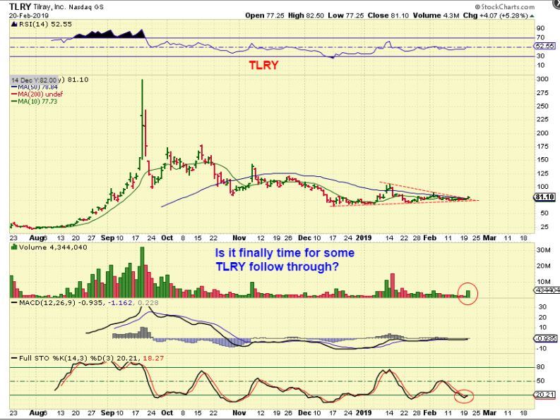 TLRY – NOTE: I have NOT mentioned TLRY since owning it on the fast run last Aug-September. I have NOT mentioned it once with all of my MJ reports on ACB, HEXO, CRON, TGODF, etc etc. Why? Because it did not look ready to me. Does it now? I Bought this yesterday and may add if it gets moving higher. I see many things that I now like, and now this looks like a better base with rising lows since December. Let’s zoom in.