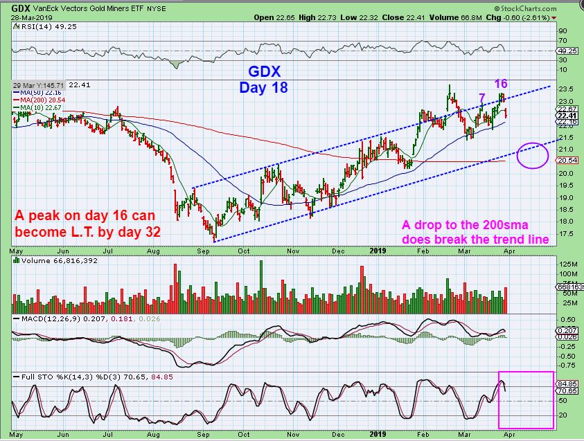 GDX – Miners gapped down, after returning to the highs of the intermediate run. With a day 16 peak, this will become L.T. if the selling lasts 32+ days. A drop to the 200 sma should be expected, and there was a gap left behind at the 200sma. Look at the a-b-c type sell off in October to November, and I would anticipate something like that.