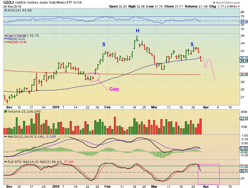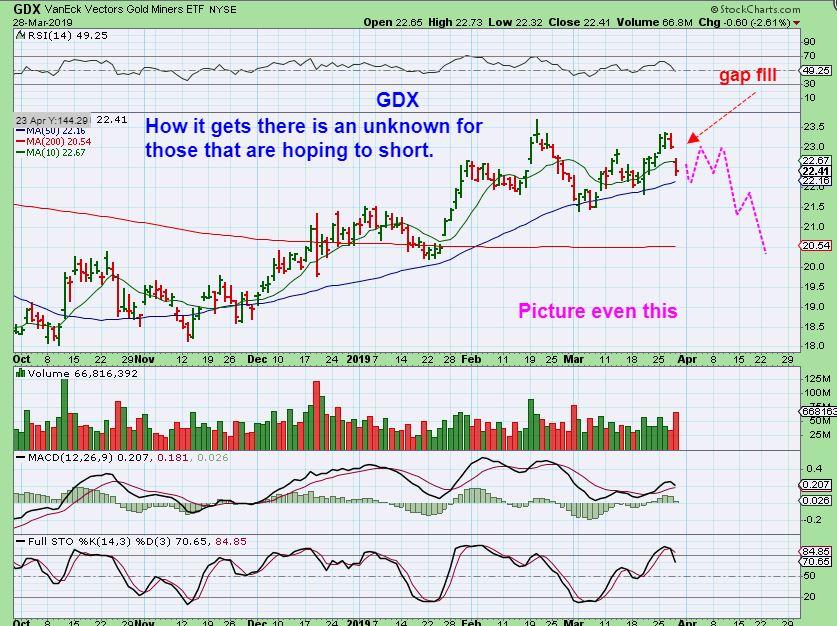 GDX – Again, for those that like to go short right away, or even jumped in JDST or DUST Thursday, as long as you know that Choppiness can follow that slam, that will help. So we could either see something like this after a tag of the 50sma or GDX may cut right through that 50sma. Time will tell, but it does look like the sell off has begun, I’d look for a drop to the 200sma.