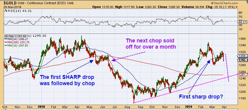 GOLD #3 – I was just looking at past sharp drops heading into the ICL, because some people like to jump in ‘short’ right after or during this sharp drop. I do think the sell off has started, but it’s good to know that it can chop sideways and then drop (blue arrows) or just follow through & drop from here (purple arrow), as seen on this chart in 2018. Knowing that can help your ‘shorting’ game plan.