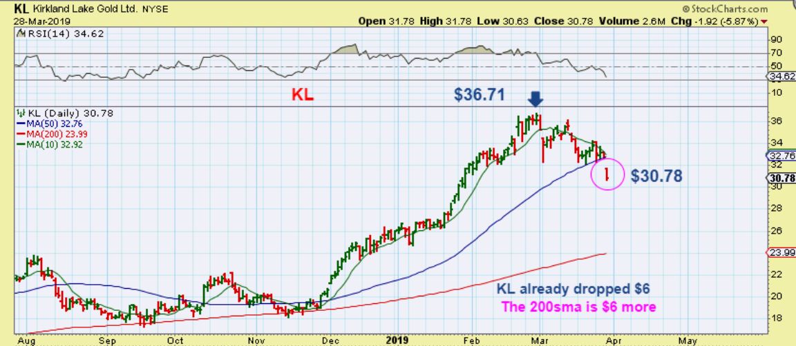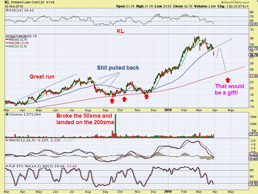 KL #1– Last September after losing the 50sma, KL was a buy at the 200sma, and it ran up 100%. Yesterday it gapped below the 50sma and was down another 6%. CAN IT REALLY drop to the 200sma again? That would definitely be a gift and it is possible…