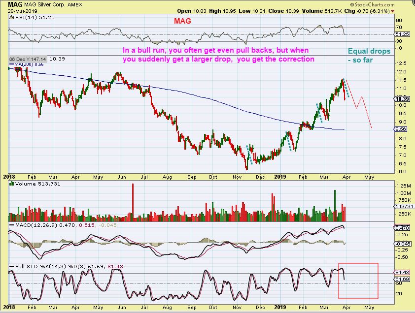 MAG #1 – MAG has had equal dips on the run higher, as shown. This is normal bullish action, but a deeper drop is evidence of the start of a correction. The 200sma could be 1 target…