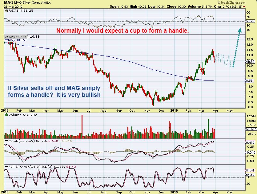 MAG #2 – Normally, I’ve seen Cups simply form a handle as shown here. That may happen, but if Silver crashes down to the bottom of the Silver base, Silver stocks may take the ride down too. If MAG drops to the 200sma as seen in the chart ABOVE, that will be a gift of a buy.