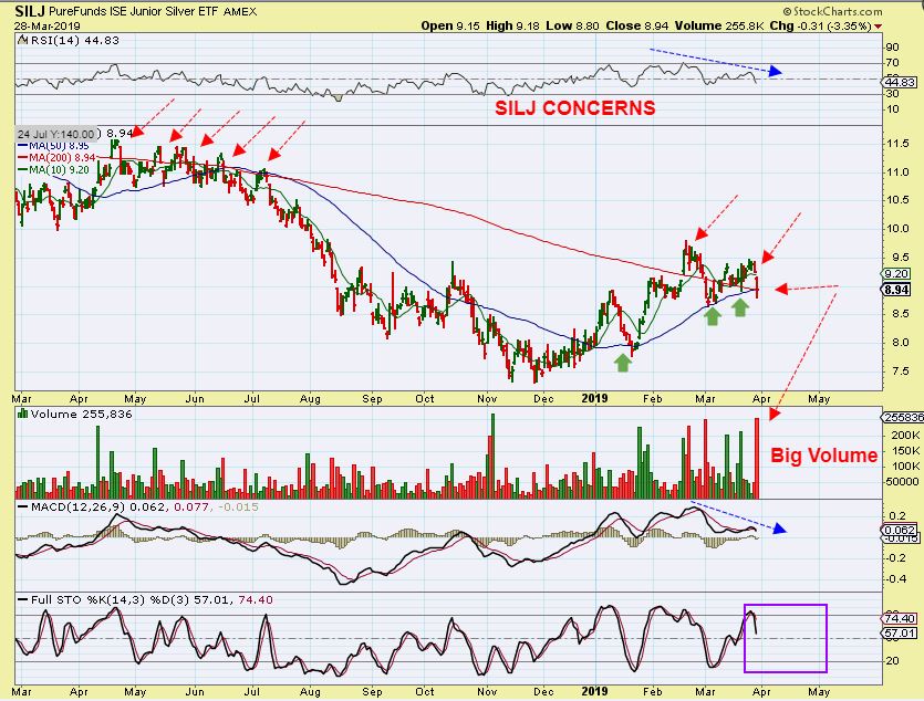 SILJ – The Junior Silver ETF sold off below the 50 & 200 sma, and volume was big. The divergence of the RSI & MACD was already showing weakness, and this actually looks like it could sell off to the base lows again too. That would be bad for Silver Miners.