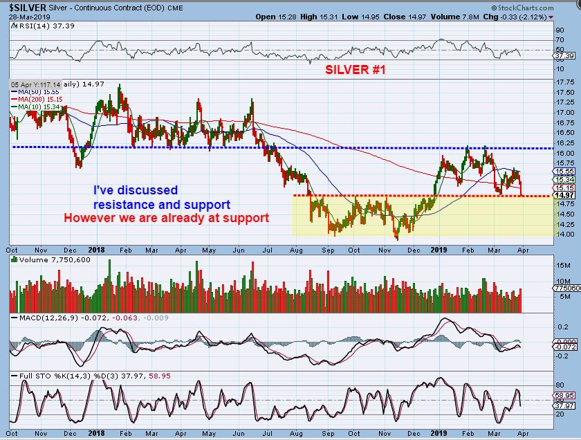 SILVER #1 – I have discussed overhead blue line resistance on Silver, and the support of the yellow base. Well, we are ALREADY at what would be support. If we are going to continue selling down to an ICL…