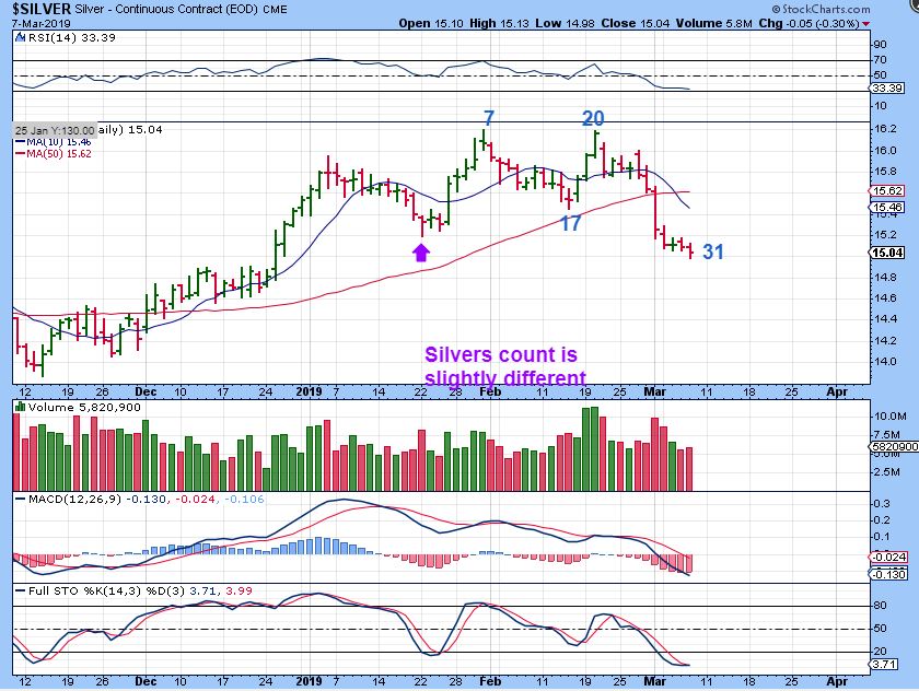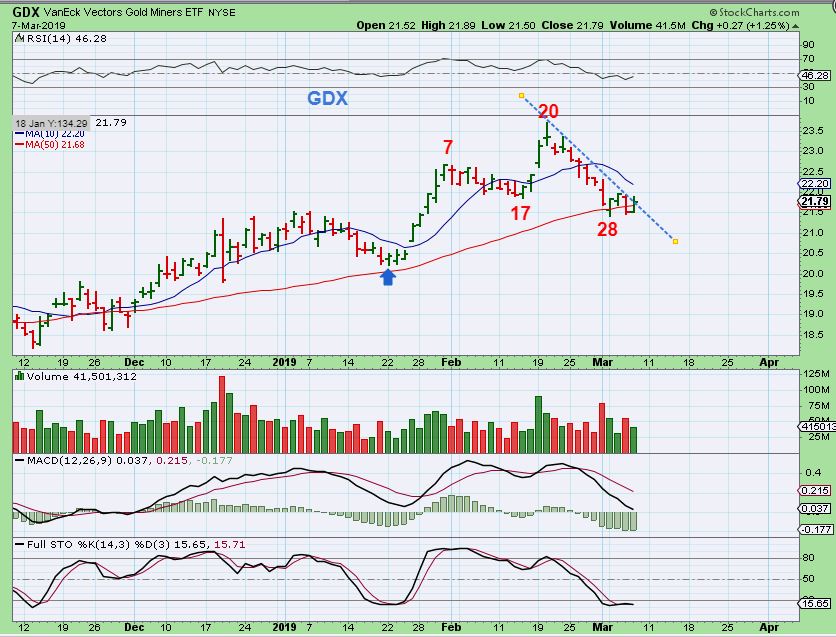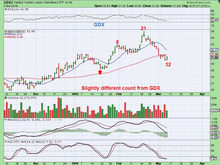 GDXJ – GDXJ has a slightly different count, because its low was Thursday.  It lost the 50 sma and has not regained it yet, but it will on the next bounce.