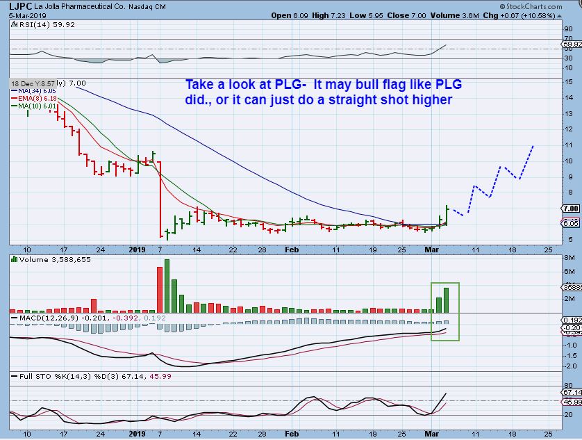 LJPC – Recently I said that I bought this ‘Earnings’ pop as it began to burst higher.  I then mentioned that this might form a bull flag,  similar to PLG, and if so , it may be an opportunity to ‘add’.  I drew this to visually help…
