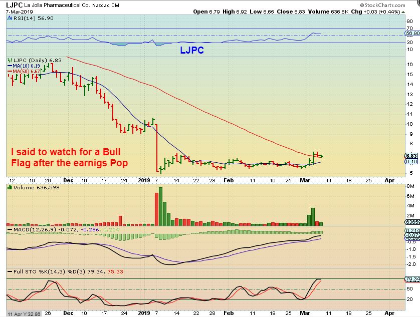 LJPC – So far that is exactly what we have here, a possible Bull Flag on support with ‘earnings’ behind us. It is riding the 50sma on lighter volume. I’m watching for a possible Pop higher.