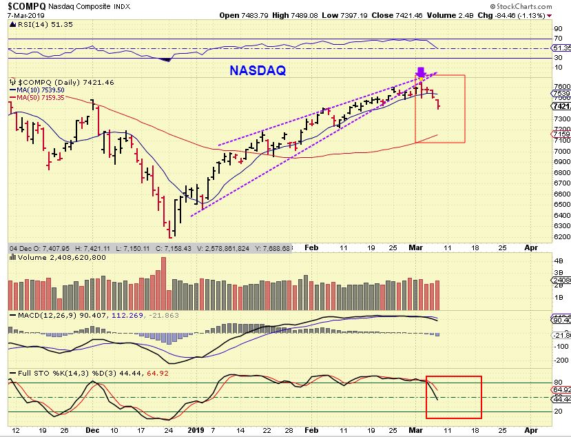 NASDAQ as of yesterdays report –  The NASDAQ wasn’t dropping yet, so I mentioned TZA & SQQQ to go short. I bought SQQQ yesterday along with my SOXS, and the NASDAQ finally started to drop.  I would expect the 50sma to get tagged.