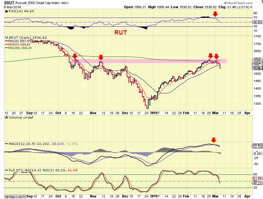 RUT – The Russell 2000 is leading the way down after pushing against resistance too. This also really looks like all one daily cycle.