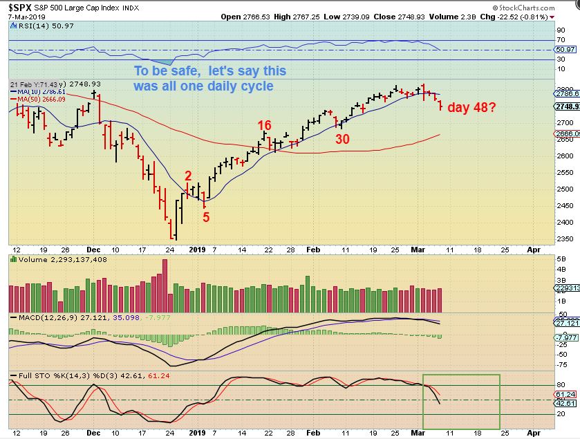 SPX #1 –   To be safe,  if this was all 1 daily cycle,  it would be very late and we’d be close to finding the DCL.   I say ‘to be safe’  because we would be aware of timing & would look for a reversal to close shorts,  However…