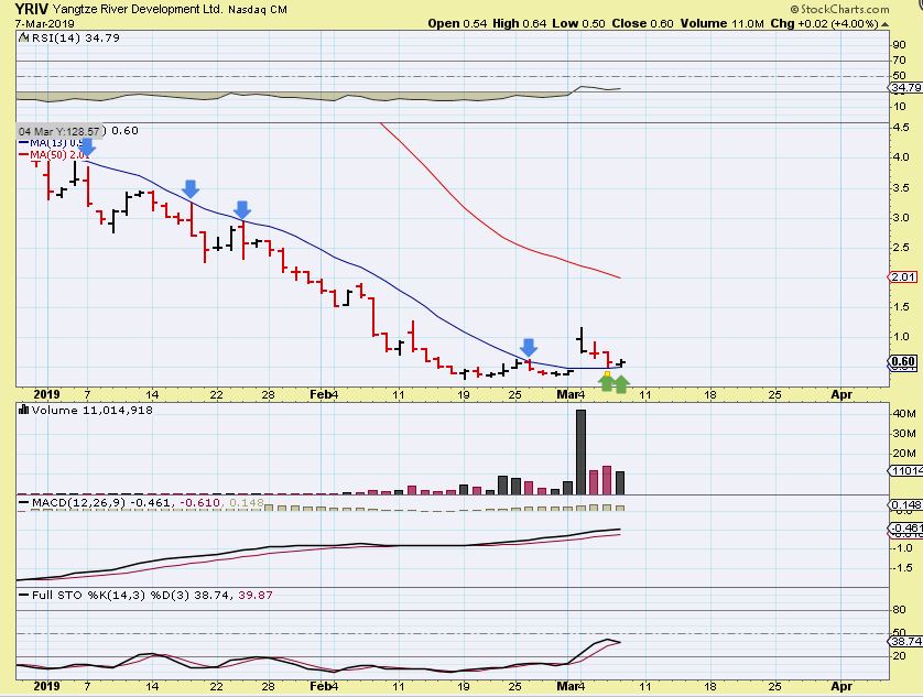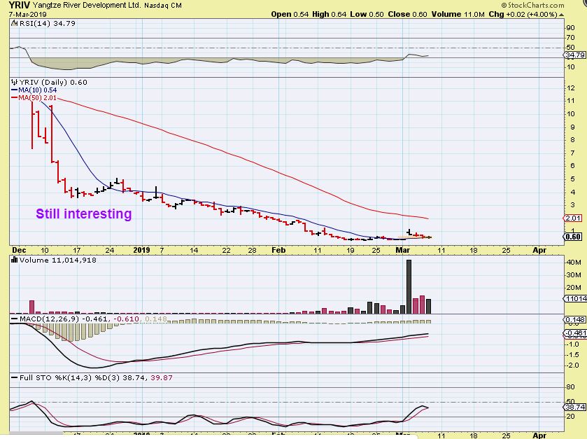 YRIV–  It dropped right to the 13 sma and seems to be holding there so far,  filling that gap to $1. I think that it still looks interesting  and has potential, but it is high risk.  The problem?   Will it Pop & Run now, or base out & run later?  Honestly, this could base out for weeks, we’ve all seen that, but I do like the potential if it doesn’t break down.   Maybe it can be puton a watch list if it looks like something that may interest you.