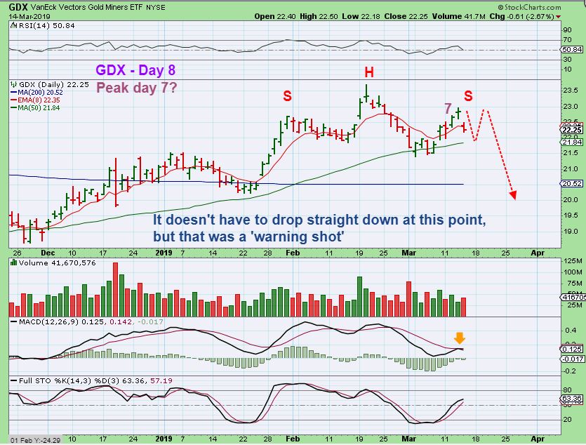 GDX dropped Thursday. It has a day 7 ‘peak’ so far, but we’ll have to wait & see if the highs of this run are in (The H&S that I have been discussing) , or can it bounce again to a new peak. That MACD is weak , so far.