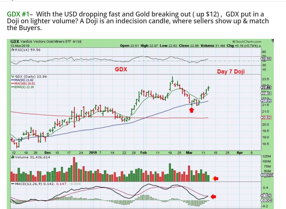 GDX – Yesterday I pointed out that I didn’t like the weak volume DOJI candle on a day when Gold was up $12.