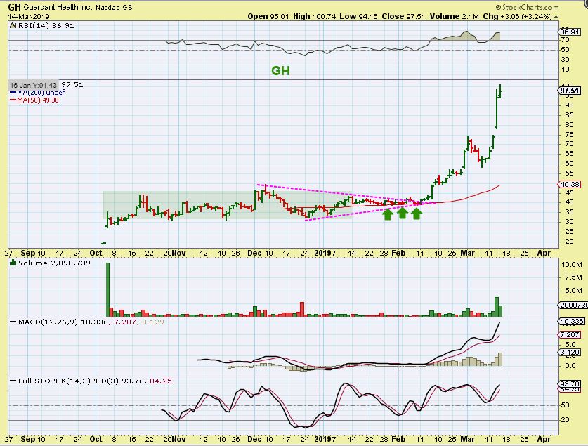 GH – I just wanted to show this one again. I owned this in the base and sold WAY – TO – EARLY. It hit $100+ Thursday. If you see price in a nice long base and it breaks out in a bullish sector with no resistance overhead…. STAY ON BOARD. I am still watching for TWST.