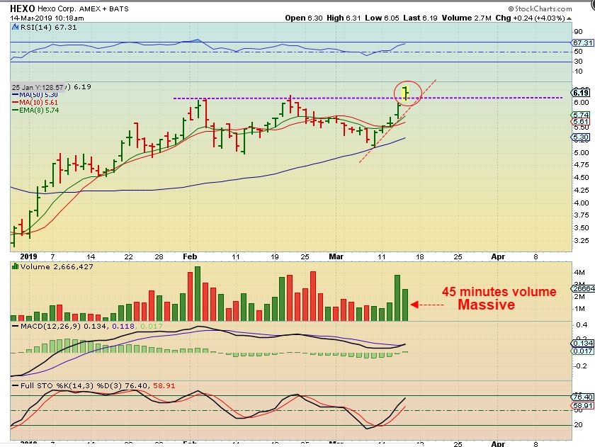 HEXO #1– HEXO broke out, and I captured this after almost 1 hr of trading. Volume was huge and it looked to be doing a gap fill. I took a position and I’d like to see it stay above the 10sma & continue higher. A drop to the 50sma is POSSIBLE, but it already broke out in January & did a back test last week, so it doesn’t have to, and…