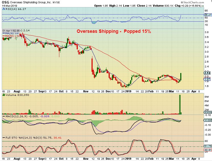 OSP – This ‘shipper’ didn’t look like it was going to pop 2 days ago when I looked at it, so I didn’t mention it. Earnings was released a week ago and it didn’t look very good, dropping a little each day below the 50sma. Suddenly, it just broke out Thursday, so the sector still seems to have life in it.