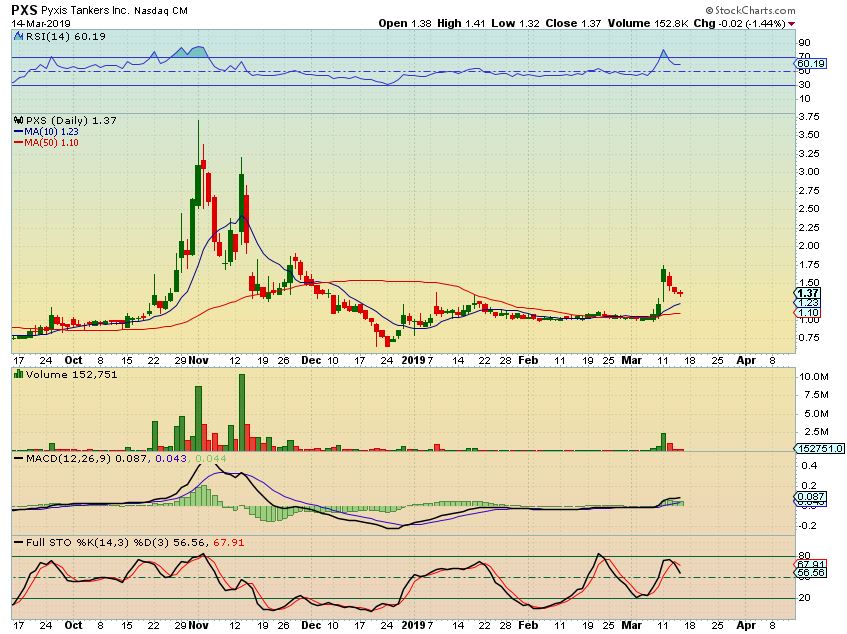 PXS – The Shippers have been Popping & running, you can look at charts of GLBS, PXS, NM for examples. We got a very nice POP in NM so far, and PXS here popped and may be slowly setting up bullishly again. This is not a ‘buy’, it is an example of shippers popping, because …
