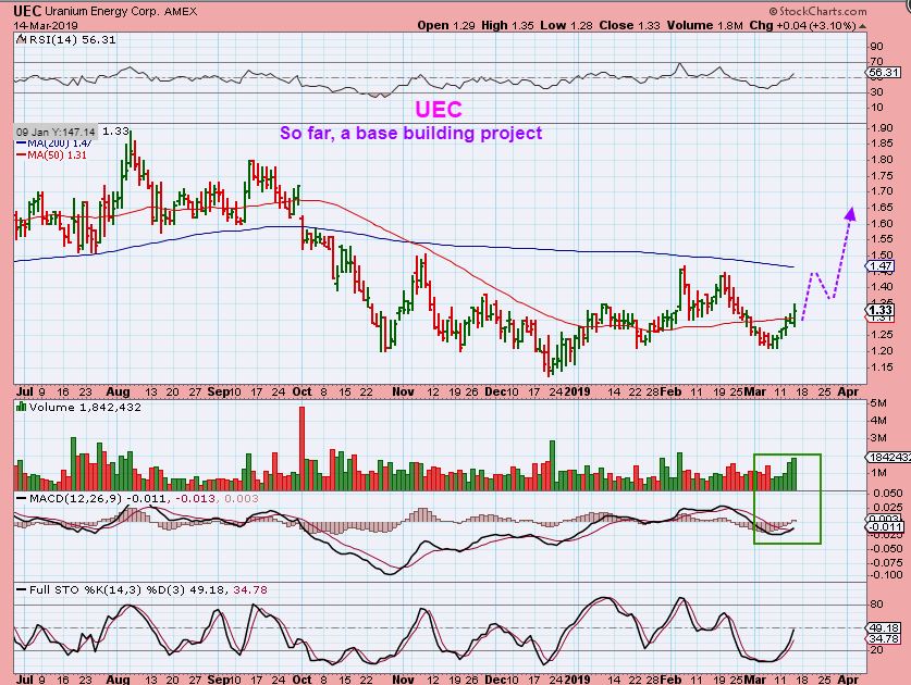 UEC – URANIUM STOCKS started perking up and they all have ‘bases’ froming. One of these times, they will run up and break out as shown here. Volume increased and they look like a buy ( At least for a short term move higher). UEC Closed above the 50sma and...