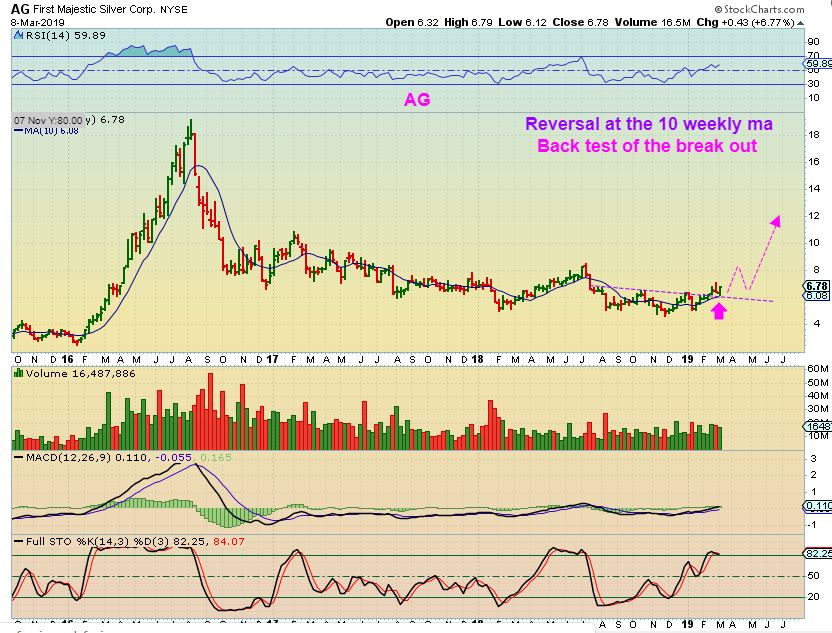 Gold & the Miners have been selling off for over 2 weeks now, but what a nice reversal GDX just had.  Keeping in mind  that a drop into an ICL for GOLD or GDX is coming due,  I wanted to mention again that that does not mean that we will see new lows for every individual mining stocks  ( I point to AU, KL, etc as examples).  Some will drop faster or further than others, some will hold up better.   In past reports I said that if you like this sector, it would be advantageous  (if you can take a little choppy wiggle action) to buy at least a couple of Miners near support.    You also may recall me saying that I was expecting SILVER stocks to either play catch up or play out bullishly, so I bought AG before it broke out.  This week I added on the back test, and these are longer term positions.  Let me show you how what I said back then does seem to be playing out.