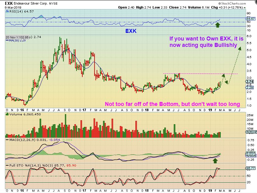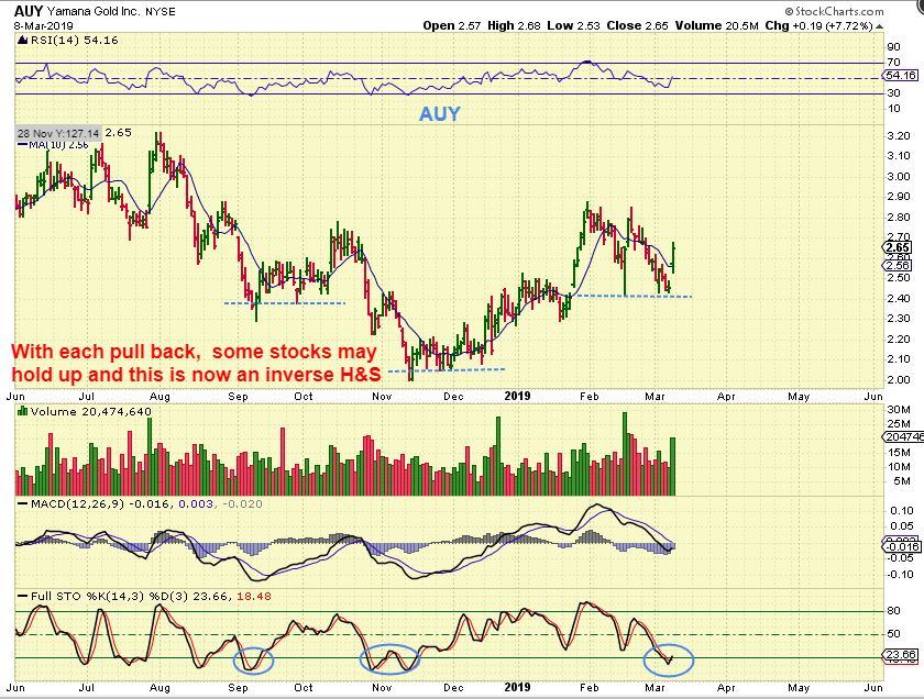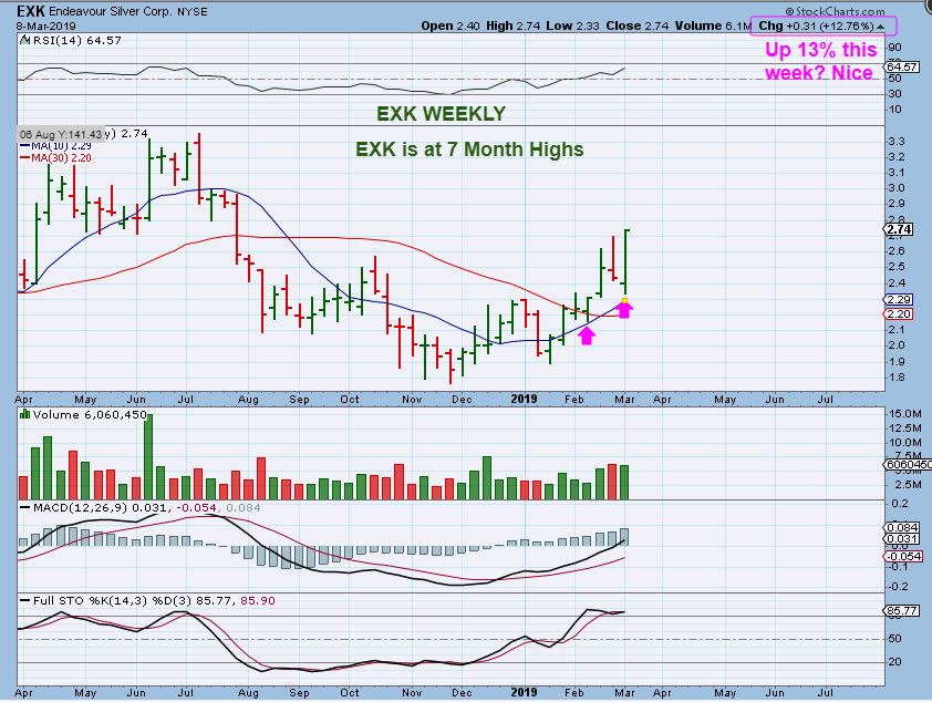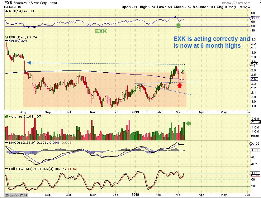 EXK – I pointed out that SILVER STOCKS were what I would look at to begin out performing and hold up better.  Many  were still near the lows, since Silver didn’t run with GOLD.   Well EXK broke above the 200sma and I pointed that out in Feb.   That is a buy with a stop loosely under the 200.
