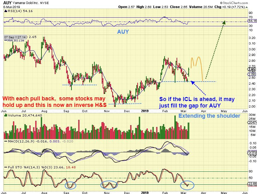 AUY #1–  AUY gapped up in January, then it eventually filled that gap.  Now AUY Gapped up again and it looks like it wants to run, but it may then just come back & fill Fridays gap at the ICL.  So the ICL may not damage some of these miners much,  just a continuing consolidation, so…