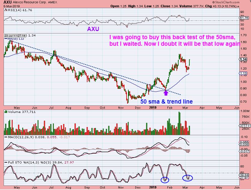 AXU– In late January I saw AXU back test the 50sma and I almost bought the reversal, but I had a lot of MJ stocks and other trades open so I didn’t.  Suddenly it just went higher & higher day after day, so I figured that I’d watch it for the next pull back at the ICL.  Well,  now I think that this is not coming back as much as I had hoped.  It is oversold and taking off again.  EXK might do this now, right?  Big Picture?…