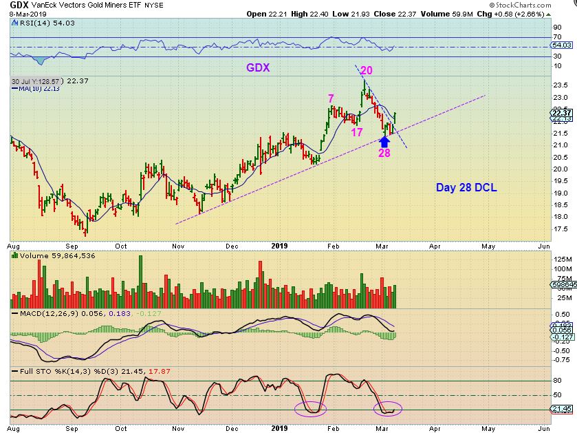GDX DAILY –   GDXJ made new lows Thursday, but GDX had its low 4 days ago, so this is a day 28 dcl in GDX, now on day 4.  It broke the 10sma & down trend line.  If an ICL is ahead, it may just do a double top here or the H&S that I pointed out before.