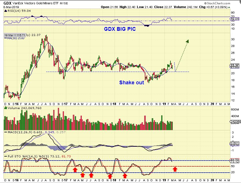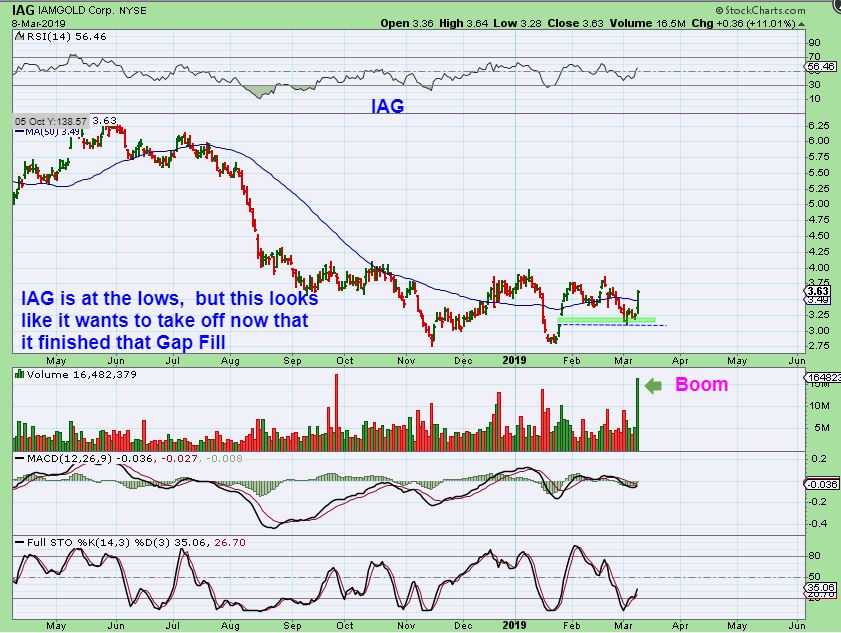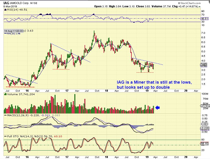IAG – IAG just filled an open gap & has now surged higher on very big volume Friday.  If this just breaks from this base, it could run strongly higher on its own,  whether GDX pulls back or not. This is still at the lows (base) , so I feel that the risk is minimal in owning it.  Zooming out…