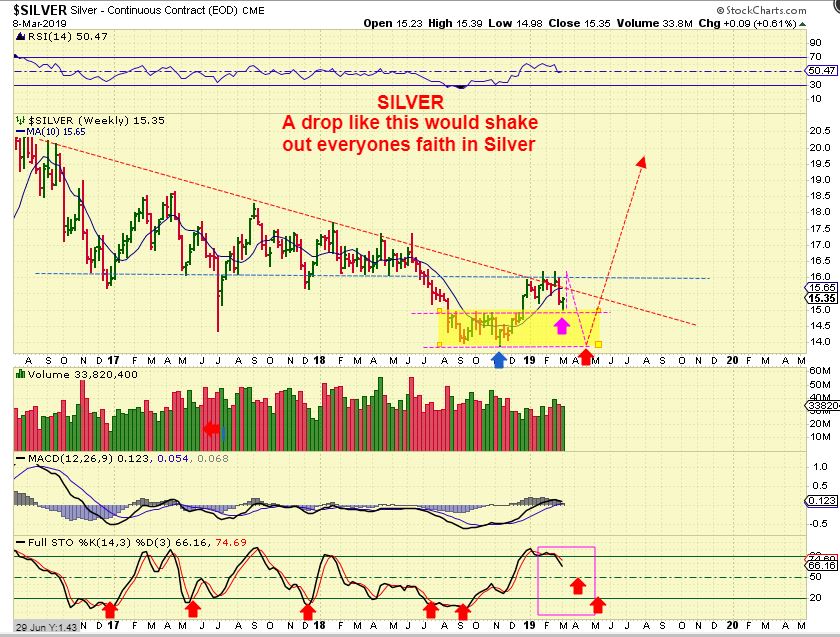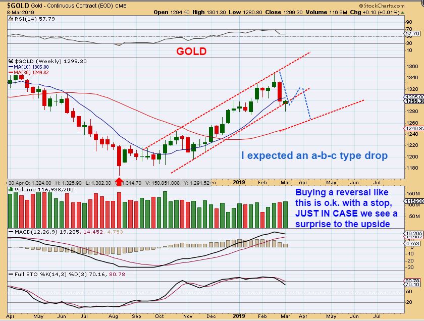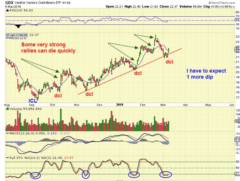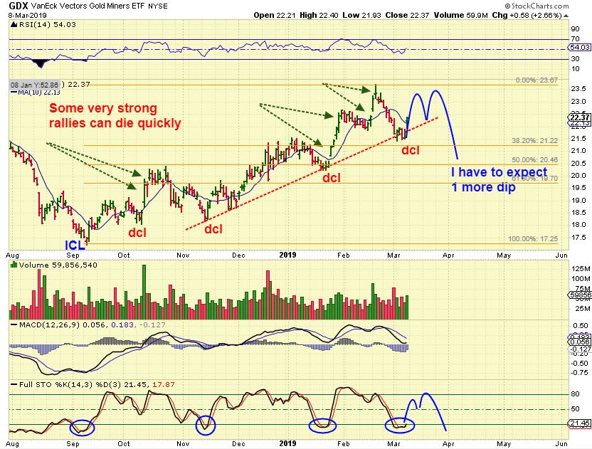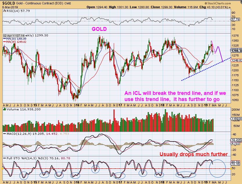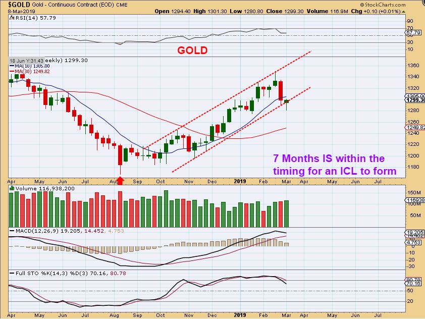 Currently we  have a dcl in place, and buying at a DCL is fine for quick short term gains.  Some miners do look like a good buy set up.  That said,  I still have to expect that GOLD will still  get 1 more drop like we usually do into an ICL.       The above was written because I wanted to show you how nicely some of these miners are acting.  Some may be worth buying here since they remain above support, like AG.    I did recommended starter positions weeks back (for longer term positions)  and so far many remain above a support level.  The ultimate buy, that ICL Dip, still seems to be ahead, as seen on the chart below.   That will be the time to go all in if you have been waiting for a nice rally in miners.   2019 still looks to be a good year for Miners.