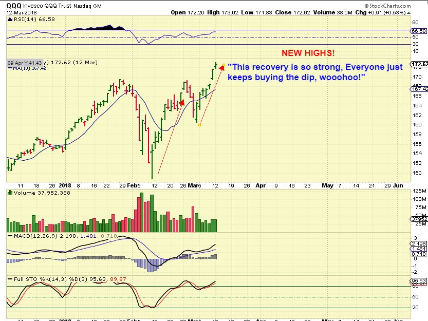 QQQ – When something ramps up out of the lows, like the General Markets have been lately, emotions do get a charge out of it.  It starts to seem that there are no sellers, only buyers, and this can only go higher with all of the good news around.  Well let’s look at QQQ as of March 2018.  After an ICL sell off, it ramped up beautifully too.  Buying with a trailing stop was the way to play it,  and…