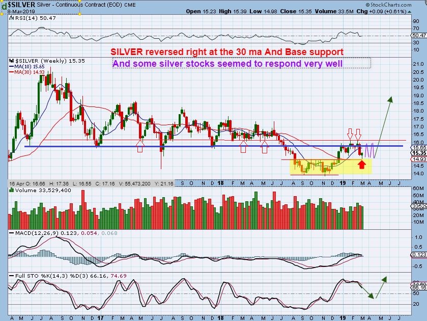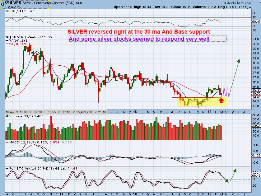 SILVER WEEKLY #1 – Silver is another story.  It did not rally like Gold.  Silver dropped to and reversed at the top of the base support & 30 weekly ma this week.   I have said that I like Silver Stocks, because they are not extended and when the time comes to run,  they will add good gains to your account. (  I’ll discuss this again later in the report too).
