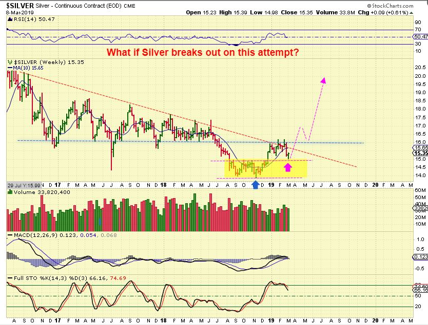 SILVER WEEKLY #2 – In reality, Silver didn’t rally with Gold  AND it did not even recover from the break down yet, though Miners have, and that is what makes this tough to analyze going forward.  What will it do next, if it hasn’t followed Gold or Miners?  It may just chop around and continue to do it own thing between support & resistance as shown,  remaining slightly out of sync with Gold & Miners .  OR…