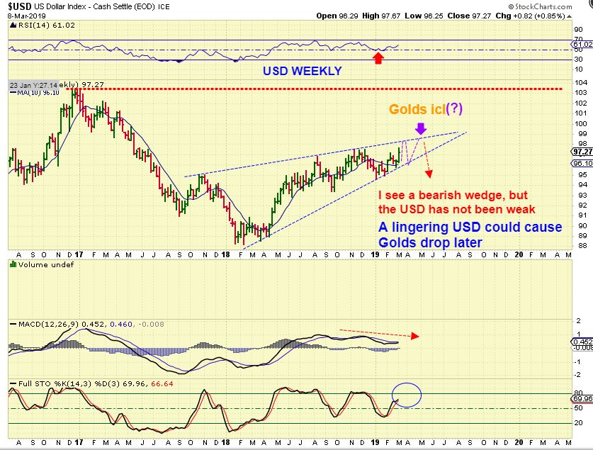 USD WEEKLY –  This looks like a bearish rising wedge, but the USD has internal signs of strength, so …