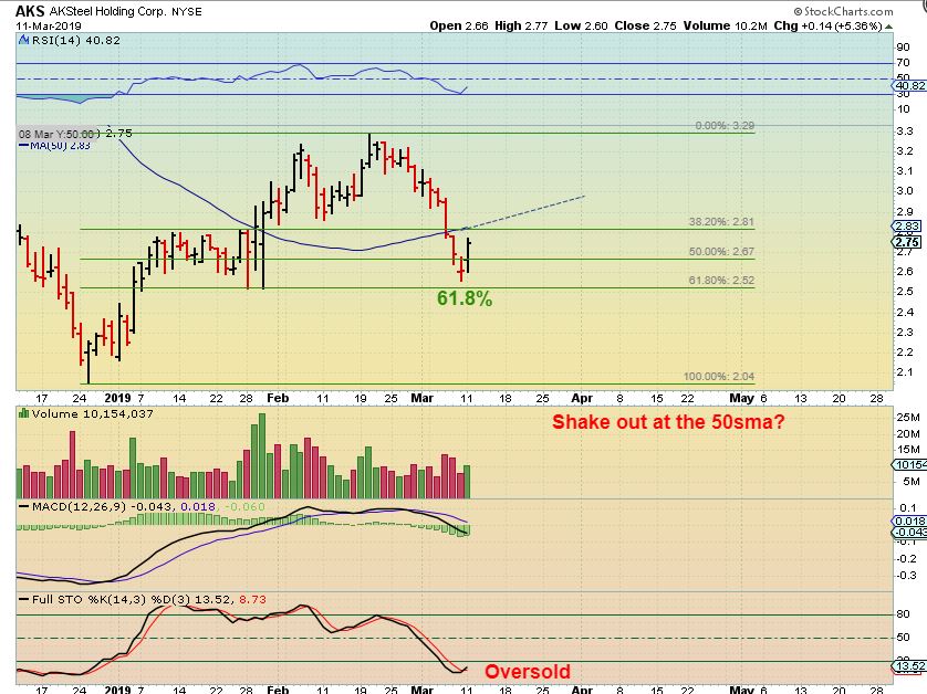 AKS – Similar set up here with AKS. It is oversold and the 50sma is now curling upward, so this sector seems to be slowly progressing, but it does get caught up in the sell offs when they come.