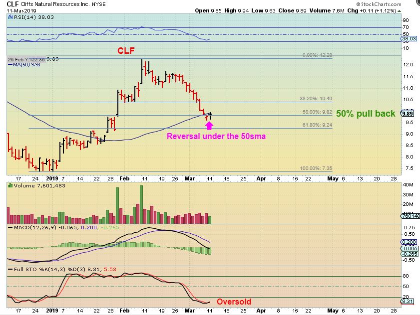 CLF – Some of the metals sold off rapidly, likely as the USD turned bullish and markets sold down. They look to possibly be ready to start moving higher again. CLF did a 50% pull back (normal) to the 50sma (Normal). It is oversold, so this could be bought moving back above the 50sma with a TIGHT STOP under these lows.
