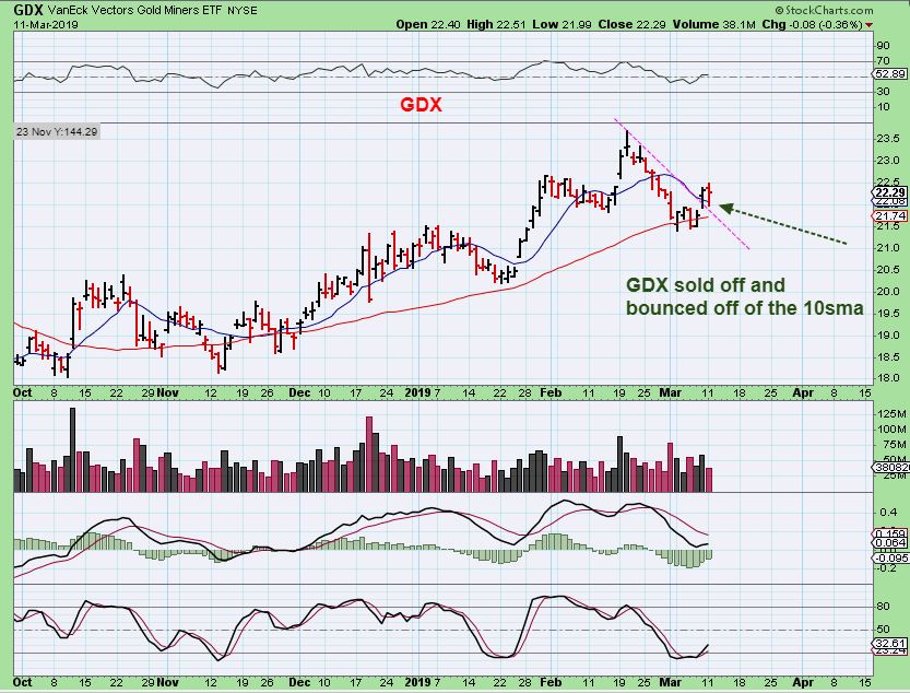 GDX – GDX closed above the 10sma & the trend line Friday. As Miners sold off on Monday, the GDX sold off to that 10sma, and bounced off of it. This looks to be day 5 for GDX. It remains oversold.