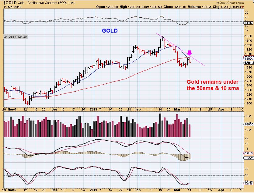 GOLD MONDAY – Gold still did not close above the 10 sma or trend line ( or 50 sma) yet, to confirm a DCL in place. It is oversold, we have the reversal, and the GDX has confirmed a swing low, so I still assume that GOLD will pop higher soon too. This is pushing on resistance.