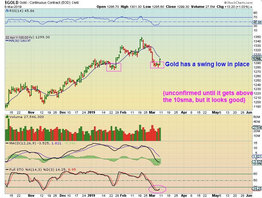 It looks like the Friday reversals could have follow through upside, since the General Markets closed above the 10sma. We only had a 1 week sell off in the General Markets, but some stocks pulled back quickly or sharply, and then reversed. They may be ready to go higher again. Gold does not have a confirmed Swing Low (DCL), but GDX & GDXJ seem to, so buying with a TIGHT STOP under recent lows may be a trade that you want to take, or you may wish to wait for a deeper sell off. I am going to discuss some trade ideas below, for those that want a few trade ideas.