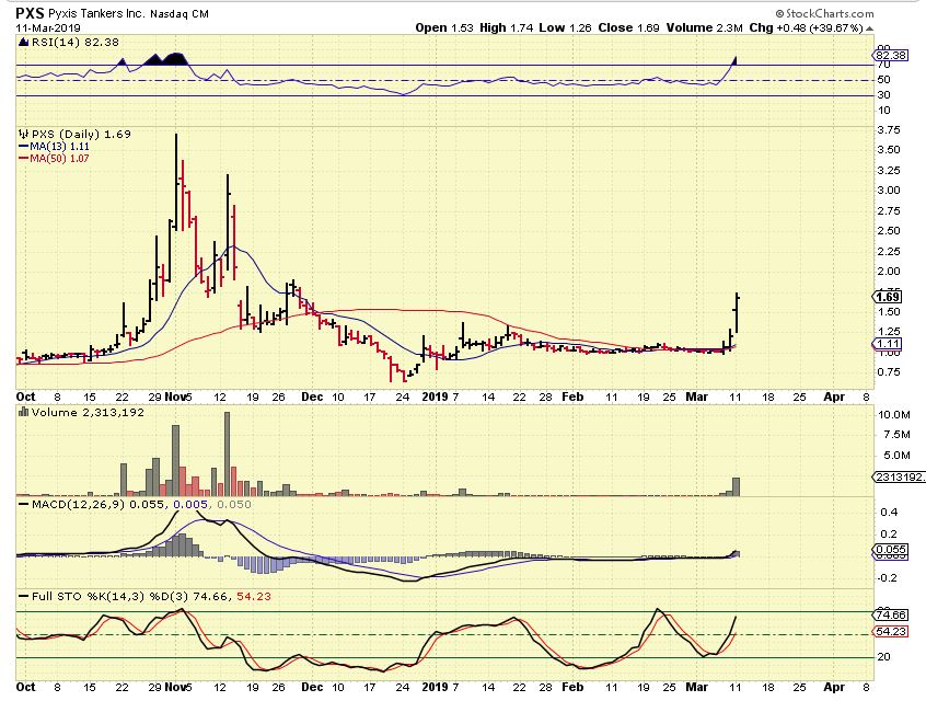 PXS – PXS also had a price & pop in volume Friday , so I watched it Monday and it really took off into the close ( 40%). I did not buy this one, but after this action , I looked up a few others.
